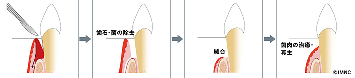 歯ぐきの中の歯石取り(ルートプレーニング)でも、歯周病が治らない場合は、歯ぐきの手術をします。