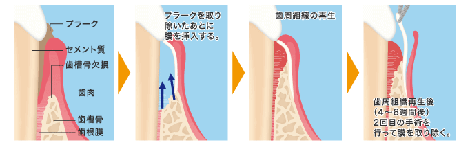 GTRとは、人工の特殊な膜「GTR膜」や特殊なタンパク質を使って、歯を支える骨などの組織を再生する治療です。