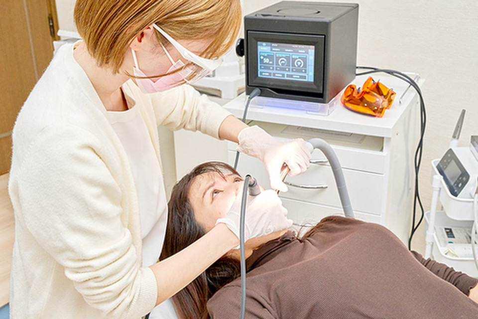 治療中に口腔内を洗い流す装置で、水と空気を使って治療部位を見やすくし、精度の高い治療を可能にします。